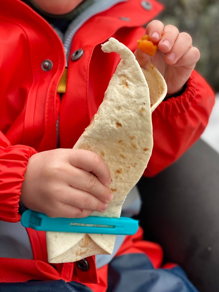 Svaret er enkelt og ganske genialt. Rull sammen lefsa og sett på en poseklype i bunnen. Poden får spist, det får du også, og så blir det kanskje litt mindre å vaske når dere kommer hjem. Velbekomme!