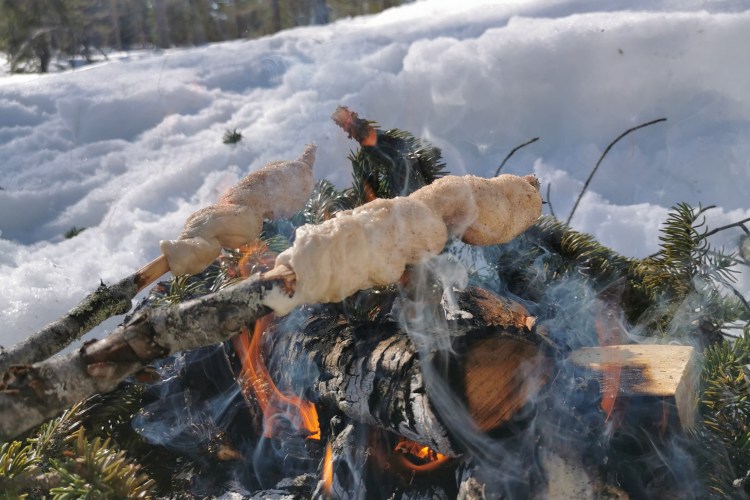 Når du er fremme ved turmålet, bålet er fyrt opp og du er klar for grilling: Finn en egnet grillpinne og spikk av barken på de ytterste ti centimeterne. Ta en klump av deigen og form en tynn pølse med hendene. Snurr pølsen rundt den bare delen av pinnen, og klem litt så den sitter godt fast. Dypp deretter pinnen i posen med sukker og kanel slik at deigen dekkes av blandingen.