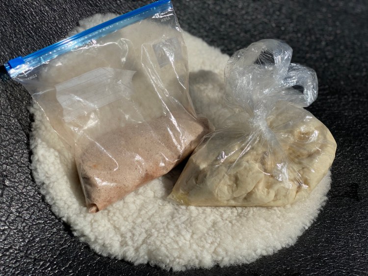 Bland alt det tørre i en bakebolle. Ha i vann og olje, og rør til en fast deig. La deigen heve på lunt sted i ca. en time. Ha litt olje rundt deigen, og legg den i en plastpose eller plastboks. Du kan også ha deigen over i en plastboks eller isboks før heving, så kan den heve i sekken mens du går. Velg da en boks som er omtrent dobbel størrelse av deigen, så den har litt plass å heve på.
