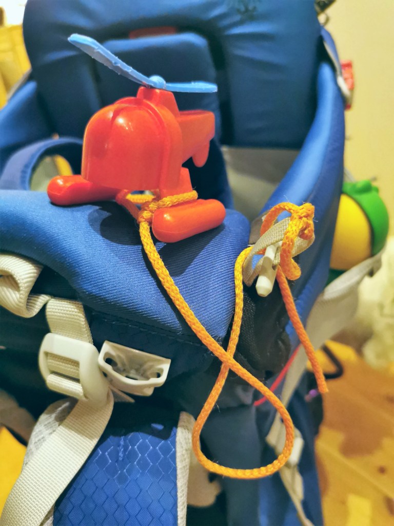 Poden vår elsker tur, men lever livet med høyt turtall. Da kan det å sitte i bæremeis være et ganske urimelig krav av og til. Et helikopter eller andre små leker festet på bæremeisen gjør at han holder ut litt lenger. Bruk en bardunsnor, hyssing eller annet tynt tau, og knyt på ditt barns favorittleker. Leken bør tåle å bli tatt av bæremeisen og lekt med på bakken, i snøen og så videre. Prøv deg frem til passe lengde på snoren, slik at poden får tak i den selv, samt har litt armslag til å faktisk leke med den.