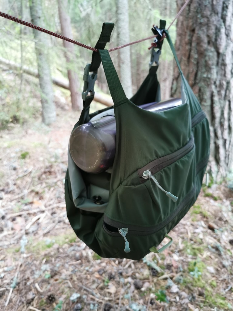Vårt nattbord henger på en bardunsnor festet rett ved siden av hengekøya. Til selve nattbordet har vi klipset av topplokket på tursekken, og klipset det på bardunsnora. Vær ellers kreativ og bruk det du har.